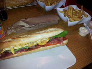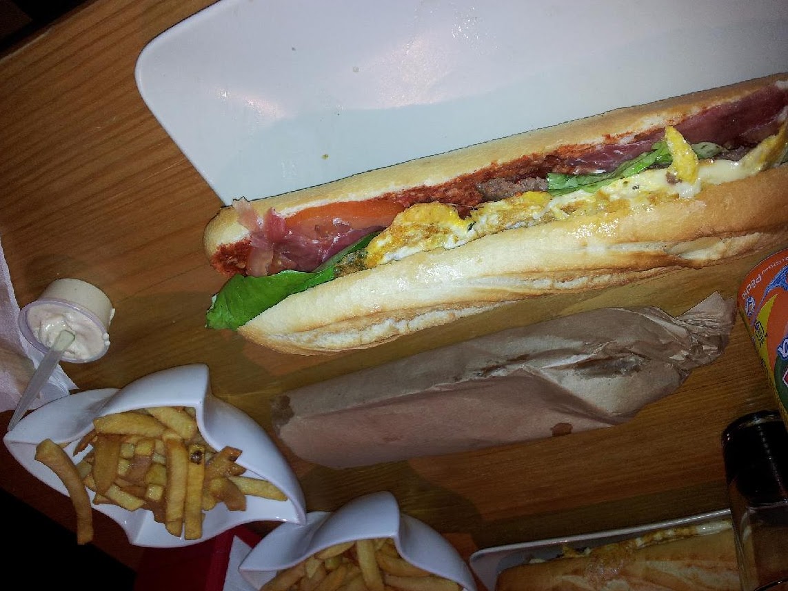 Anyhow, Que Pasa offers a wide range of sandwiches, some of them are called Hamburgesa. I didn't know that their sandwiches all look the same. You have no real hamburger bun, but a piece of white baguette, à la française. (not my thing) So basically it's only the meat that changes the sandwich into a hamburger. aha...