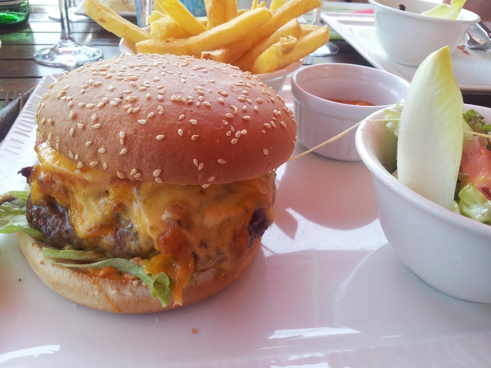 Since the weather was fine and the sun was shining I and my family reserved a nice spot on their lovely terrace. This time I've ordered their only burger on the menu, the hamburger maison xxl with a side salad, coleslaw and fries for 15.50€.